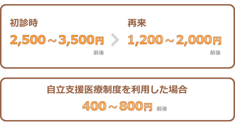 保険をお使いになる場合、初診時が2500円〜3000円前後、再来で1200円〜2000円前後となりますが、治療内容、検査内容、文書、診断書作成等によっては多少ばらつきがあります。なお、自立支援医療制度(精神通院)を利用すれば、1回の受診につき自己負担分が三分の一となり、400円〜800円程度のお支払いとなります。 以上、当クリニックの治療の状況をご理解いただき、お気軽にご利用下さいます様、お願い申し上げます。